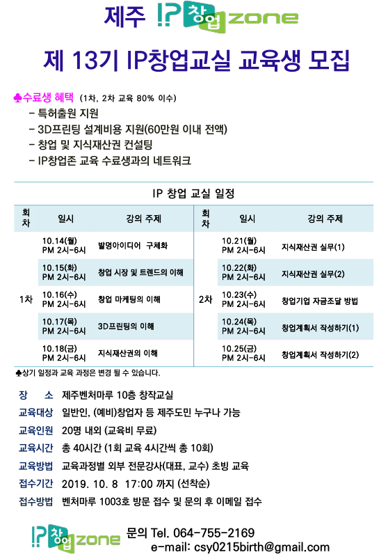 제주IP창업존에서 IP창업교실 교육생을 모집합니다.