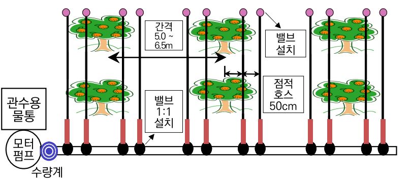 점적호스를 4줄을 설치한 경우 2줄은 나무 밑둥부분에서 70cm을 띄워서 설치한 후 그 옆으로 50cm 간격으로 설치하여야 합니다. 또한 설치 후 점적호스가 움직이지 않도록 4m 내외 간격으로 고정핀을 설치하는 것이 좋습니다.