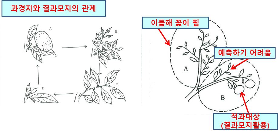 2번에 좌측 그림은 과경지와 결과모지의 관계를 나타낸 것으로 열매가 달렸던 과경지(A)는 열매가 자라면서 탄수화물을 소모하여기 때문에 다음해에 꽃이 피지 않고 순이 자라게 됩니다. 이렇게 자란 순은 여름까지 탄수화물을 축적(B)하고 가을철이 되면 꽃눈이 만들어진(C) 후 다음해에 꽃이 피고 양분이 소모됩니다.(D)