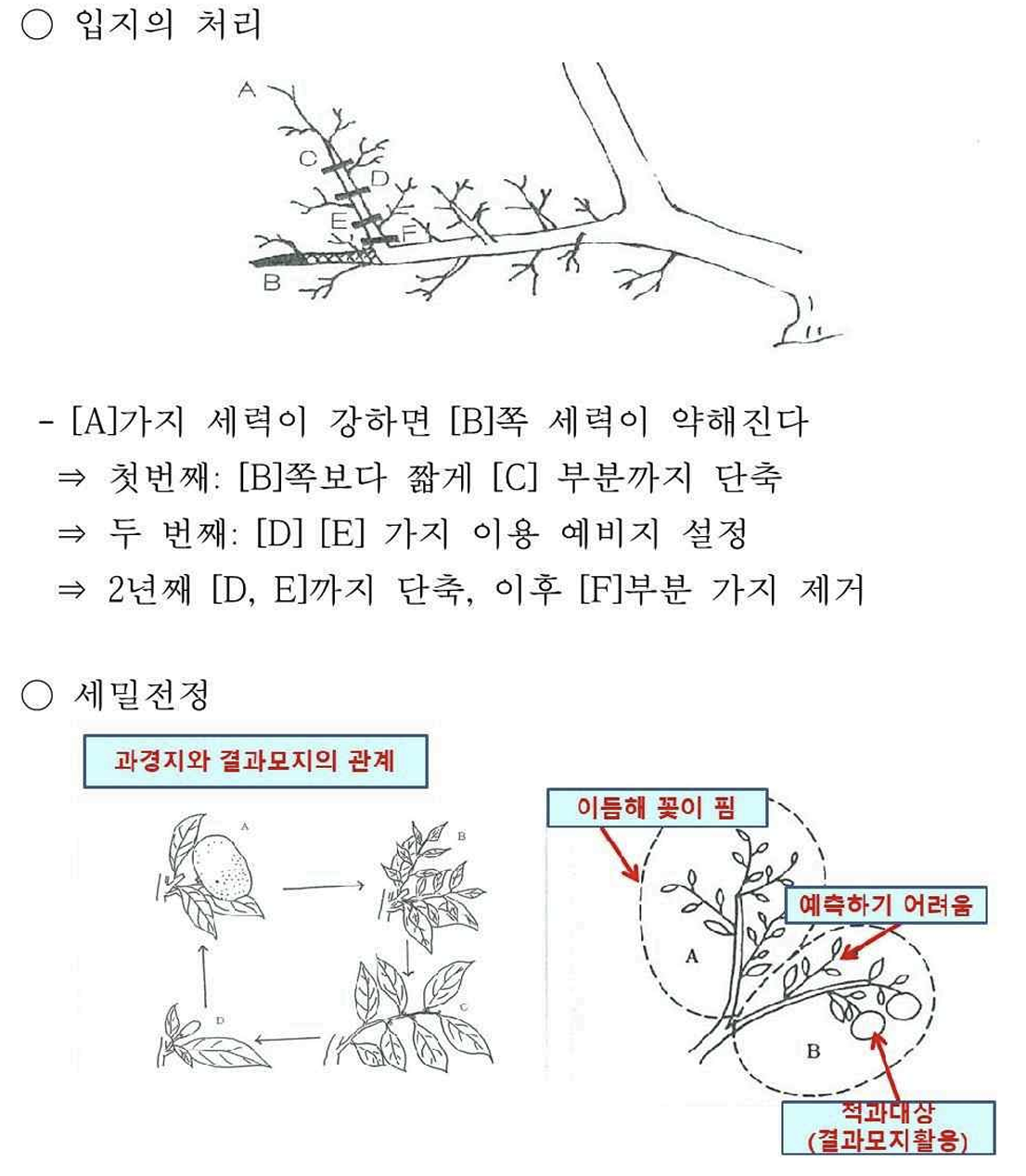 2번에 우측 그림은 예비지 또는 과경지에서 자란순(A)은 이듬해에 꽃이 필수 있으나, 봄순과 열매가 같이 있는 가지(B)에서는 양분축적이 어려워 이듬해에 꽃을 기대하기 어렵기 때문에 열매를 따내어 다음해에 꽃이 올수 있도록 해야 합니다.