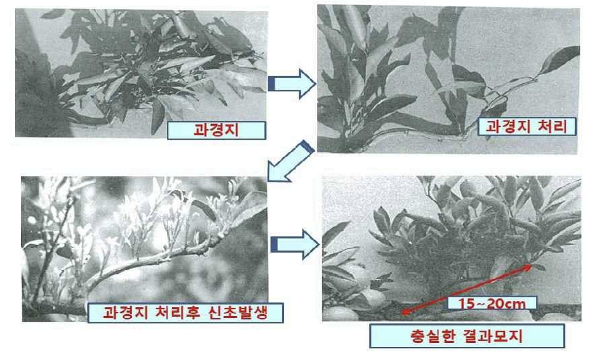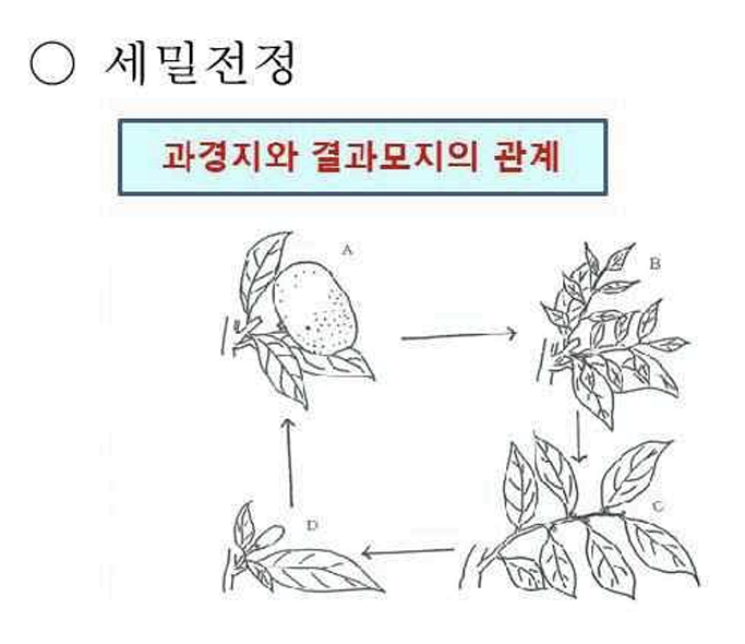 2번에 좌측 그림은 과경지와 결과모지의 관계를 나타낸 것으로 열매가 달렸던 과경지(A)는 열매가 자라면서 탄수화물을 소모하여기 때문에 다음해에 꽃이 피지 않고 순이 자라게 됩니다. 이렇게 자란 순은 여름까지 탄수화물을 축적(B)하고 가을철이 되면 꽃눈이 만들어진(C) 후 다음해에 꽃이 피고 양분이 소모됩니다.(D)