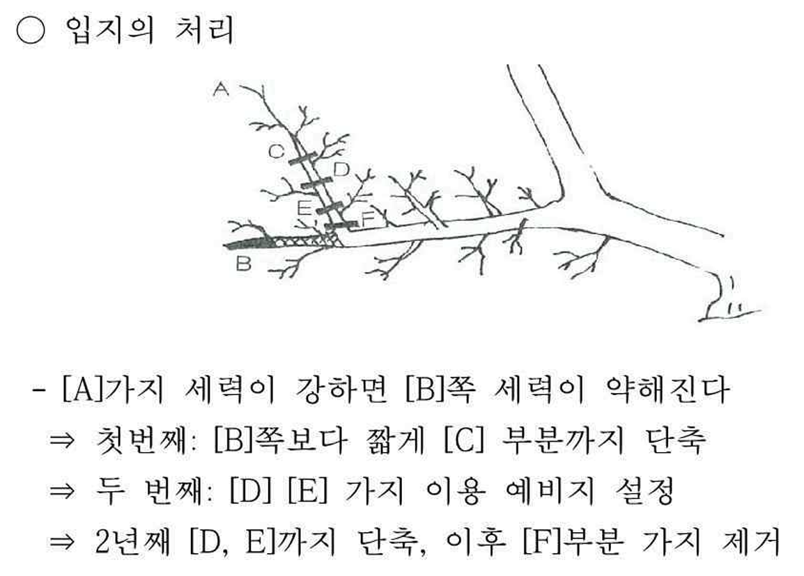 입지(立枝)는 위쪽으로 자라는 세력이 강한 가지를 말하며 옆으로 자라는 가지에 비해 세력이 왕성해 질수 있습니다. 따라서 입지(A)에 세력을 약화 시키지 않으면 옆으로 자라는 가지(B)가 약해질수 있으므로 입지(A)를 단계적으로 세력을 약화 시켜야 합니다.