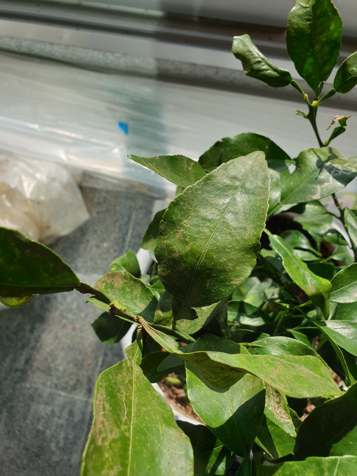 선생님이 문의해주신 사진에 보이는 잎 상태는 일부는 흙이 잎에 묻혀 있는 것처럼 보입니다. 잎을 닦아보시고 흔적이 지워지지 않으면 다시 전화로 문의해주시기 바랍니다. 일부 잎에는 작년에 귤굴나방(잎에 지도처럼 보임) 피해가 발생한 것으로 보입니다.