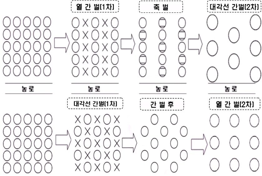간벌 방향은 남북방향으로 1/2 열 간벌을 하는 것이 햇빛을 많이 받을 수 있는 장점이 있습니다.