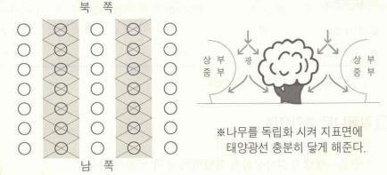 오전에는 나무의 동쪽으로 햇빛이 비치고 한낮에는 고도가 높아 남쪽으로 햇빛이 들어오며, 오후에는 서쪽으로 해가 비치기 때문에 3면에 햇빛이 골고루 비치게 됩니다.