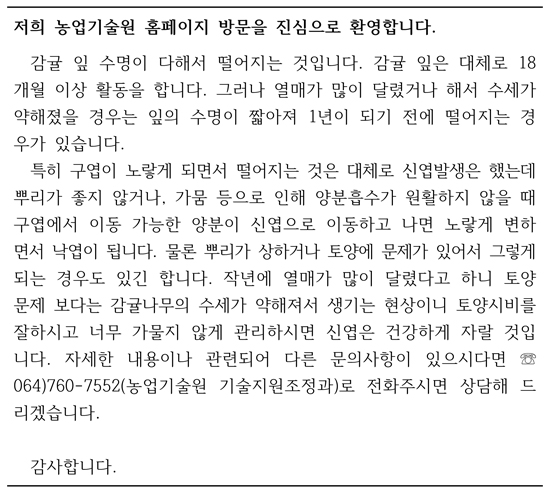 그런데 올해 귤잎이 노랗게 변하면서 어떤 나무는 잎이 떨어지고 있어요?
