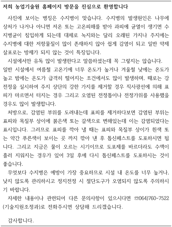 수지병 같은데 발생원인과 방제방법을 알려 주세요.