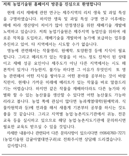 현재는 리치 재배에 관하여 어느정도 진척이 된 상태이고 재배 성공 요인이나 제주도가 아닌 다른 지역에서는 시도 해 본적이 있거나 가능한지, 불가능 하다면 그 이유가 무엇인지 또 영농 관련해서 어떤 지식을 쌓아두고 어떤 분야를 공부하는것이 바람직 한지, 현재나 가까운 미래에 메리트가 있는 작물 등 조금이라도 알려주실 수 있는것이 있다면 도움을 주셨으면 합니다. 조금이라도 괜찮습니다. 꼭 한번 도전해 보고 싶습니다!