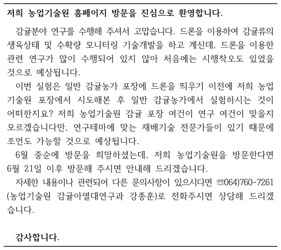 이에 관련하여 혹시 제주 감귤 농협 혹은 제주농업기술원측에서 저희가 이용할 수 있을만한 농장시설의 정보를 주실 수 있을까요..?