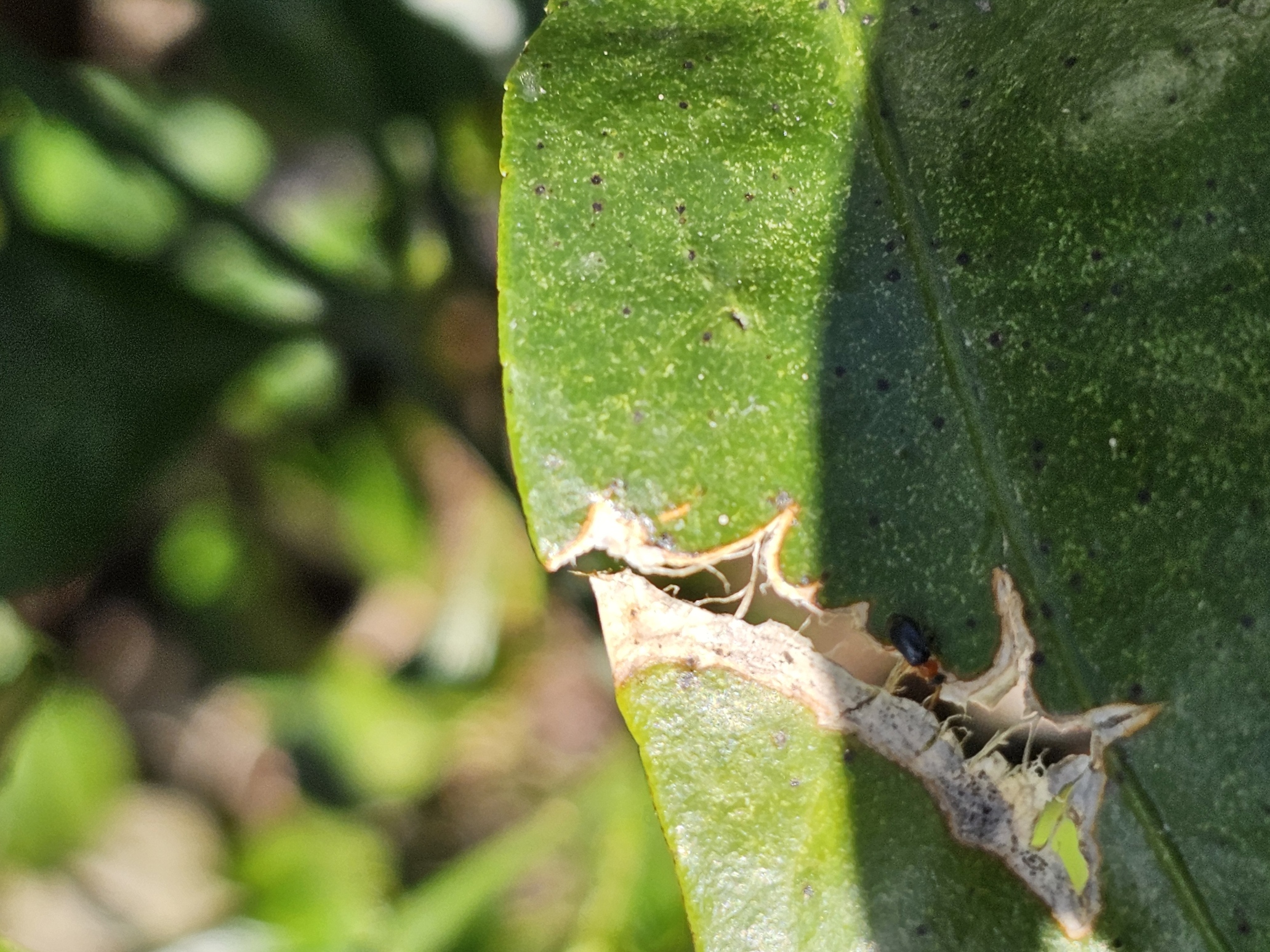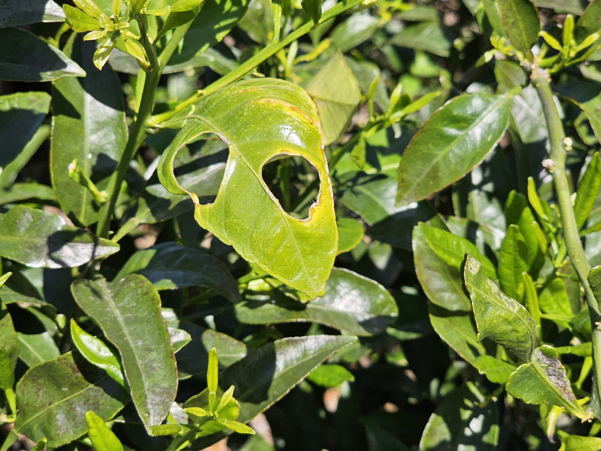 둥근 형태의 피해사진은 달팽이 또는 나방류의 섭식흔적이 잎이 자라며 커진 형태로 판단됩니다.