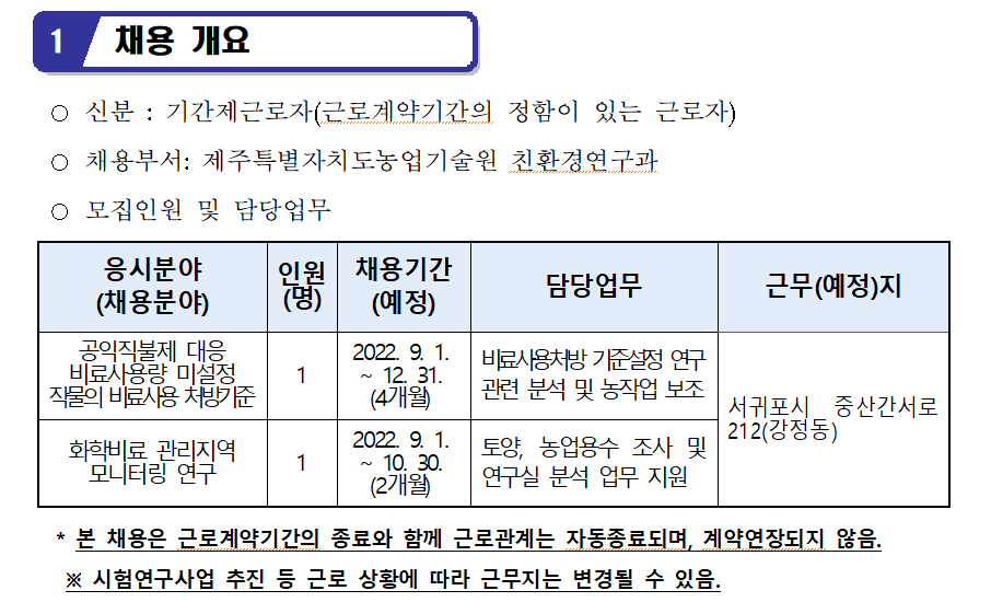 제주특별자치도농업기술원에서 근무할 기간제근로자 채용계획을