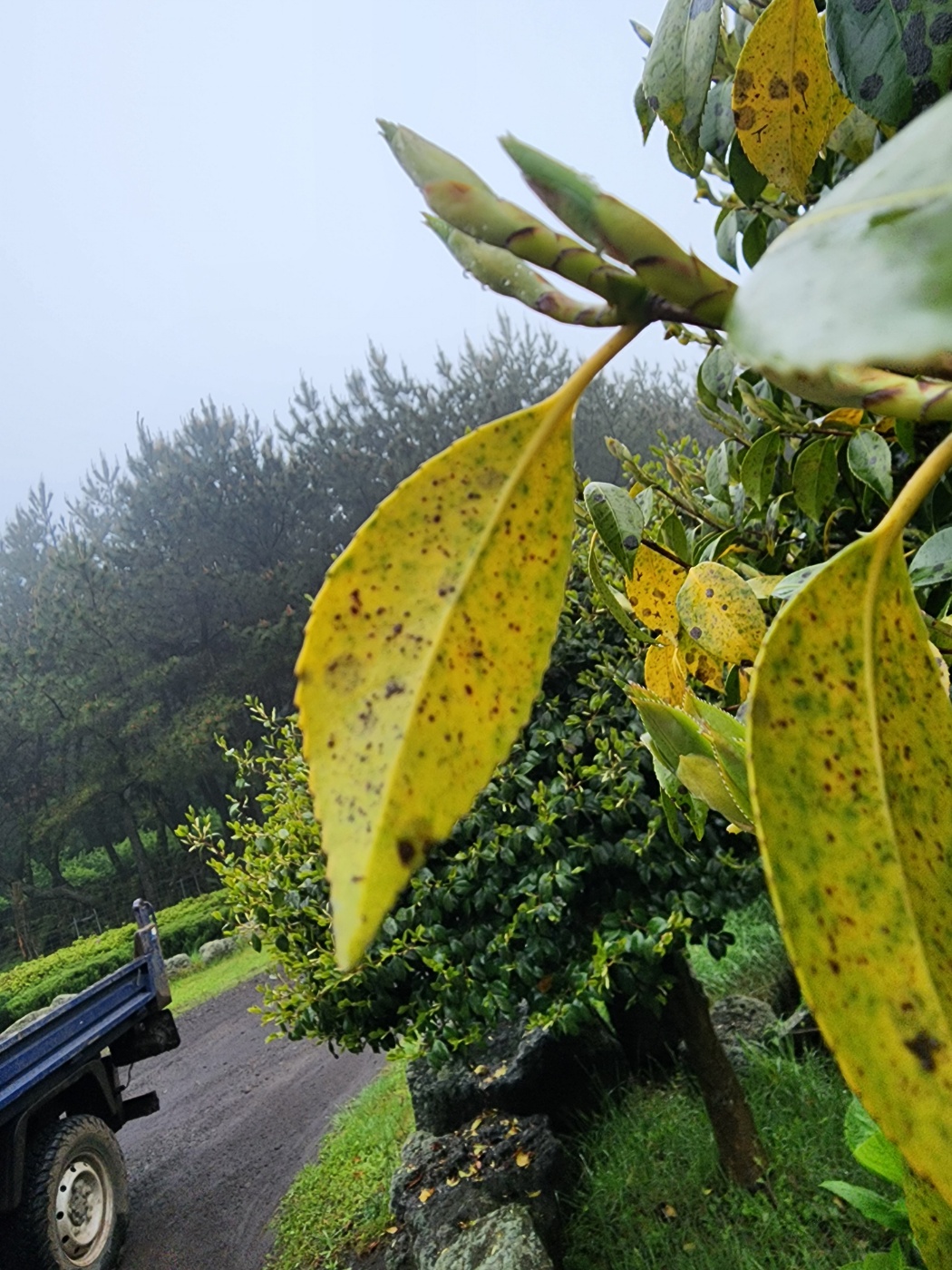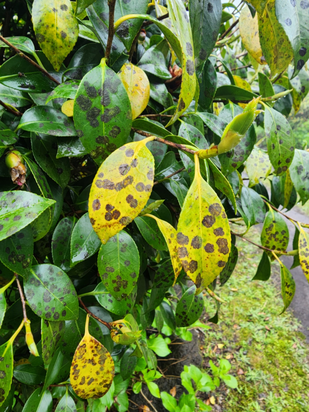 동백나무 잎에 검은 반점이 생기고 잎이 노랗게 변하고 있습니다.
