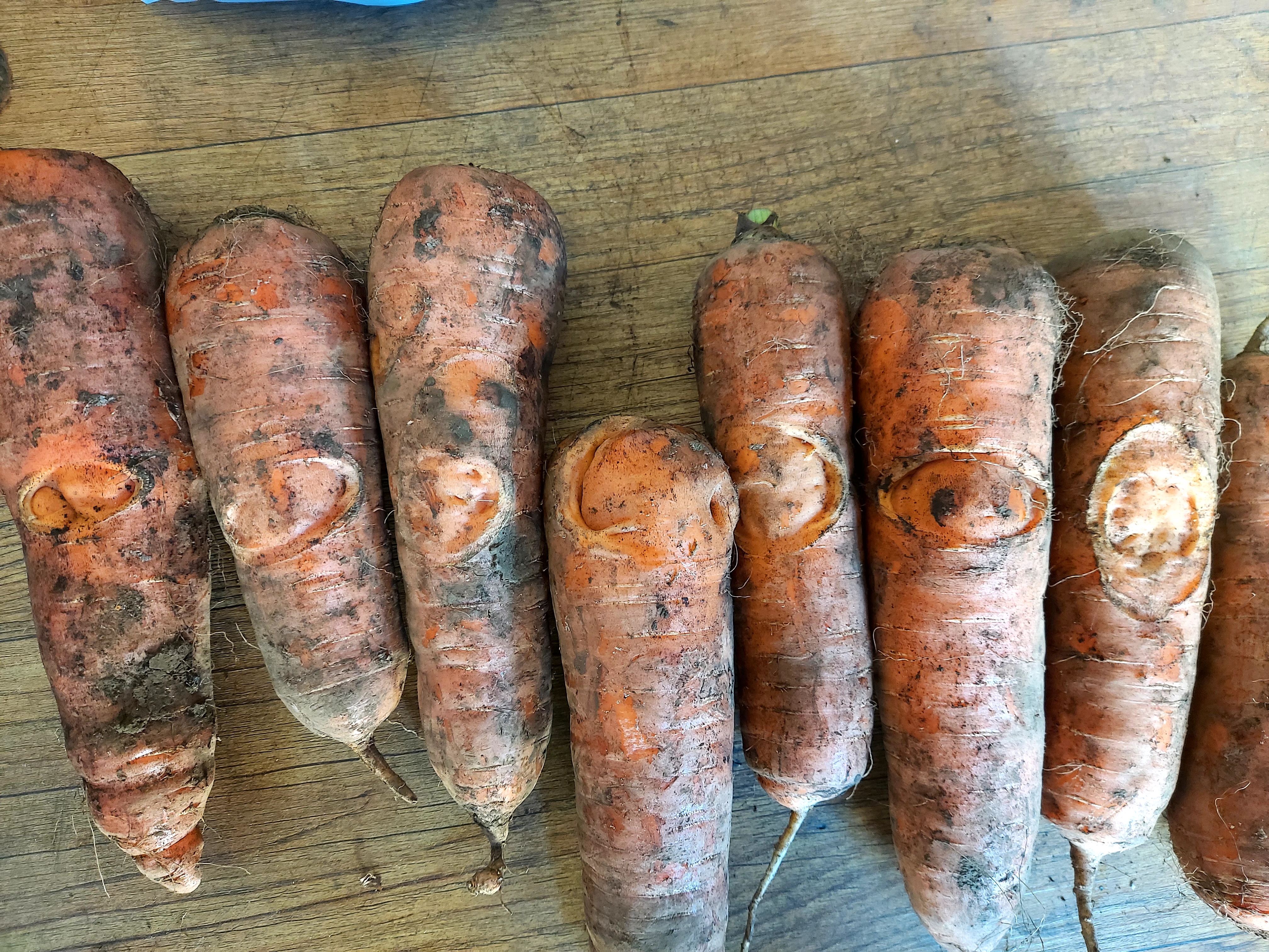 당근 수확했는데 사진과 같이 모양변형이 많습니다. 왜 이런 모양이 많은지 다음에 어떻게 대처해야 하는지 알려주시면 감사하겠습니다 밭은 한동리 둔지 오름근처에서 송당리 방향입니다. 그리고 한가지 더 문의 드립니다. 사진 첨부되지는 않았는데 당근 아래쪽이 쩍 하고 갈라진건 왜 그런가요?
