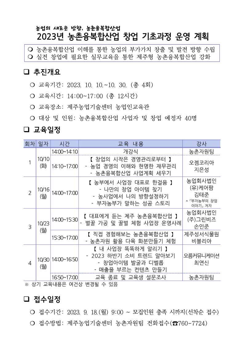 ❍ 접수방법: 제주농업기술센터 농촌자원팀 전화접수(☎760-7724)