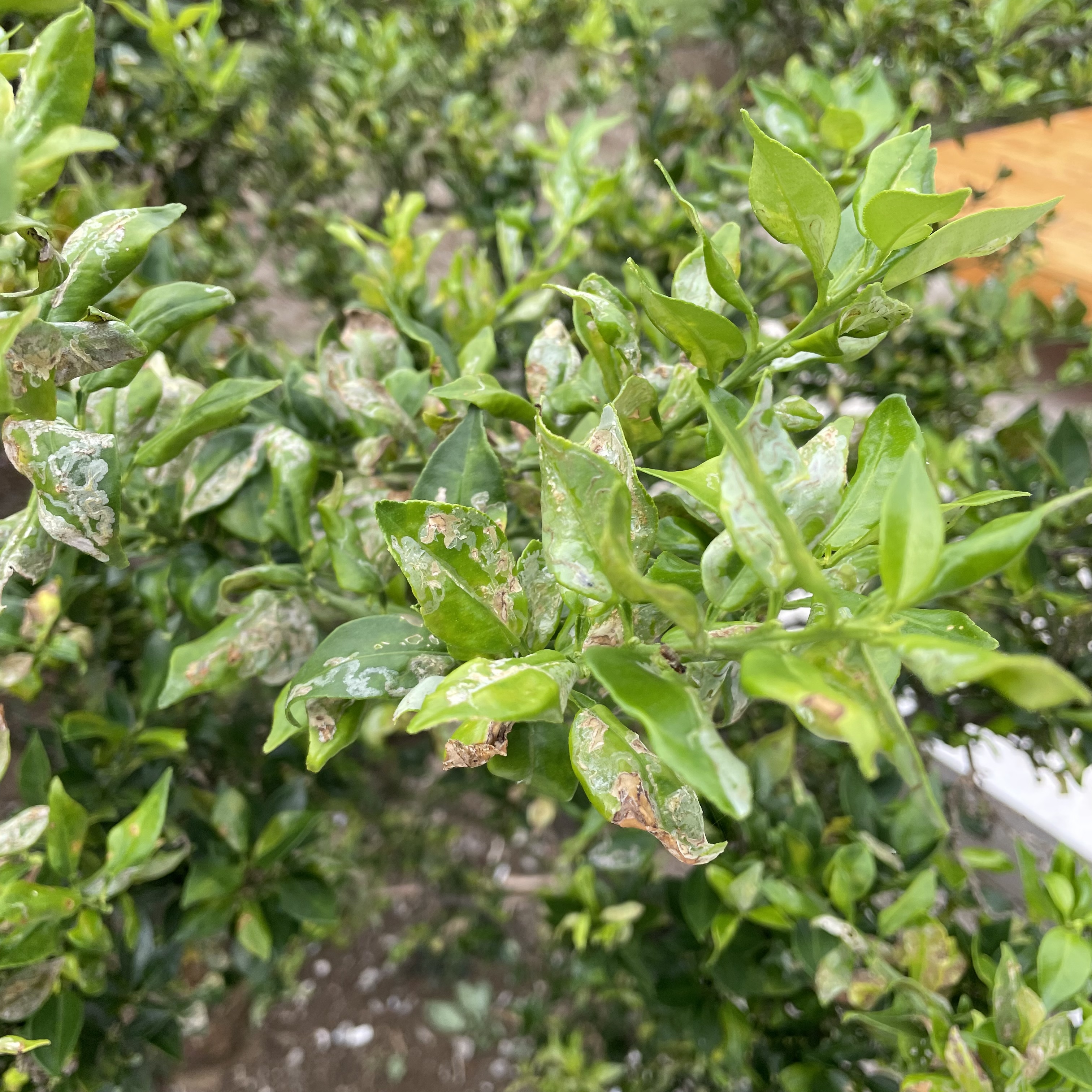 여름순 관리를 위해 귤굴나방 방제를 실시해야 하는데 그렇지 못해서 여름순이 귤굴나방 피해를 입으셨습니다.