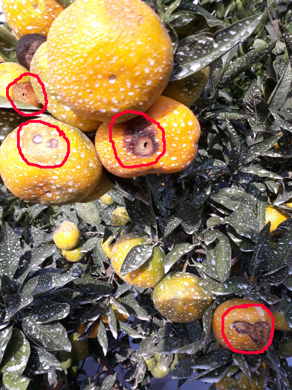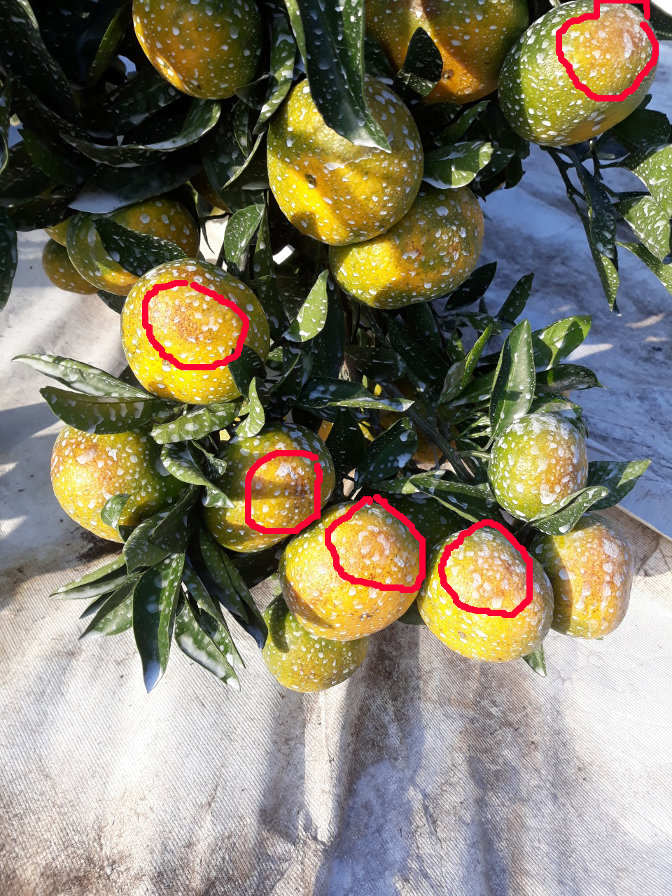 이때, 성숙기에 들어서 유포가 발달된 열매 표면에 장시간 햇빛에 노출되면 사진과 같은 증상이 발현됩니다.
