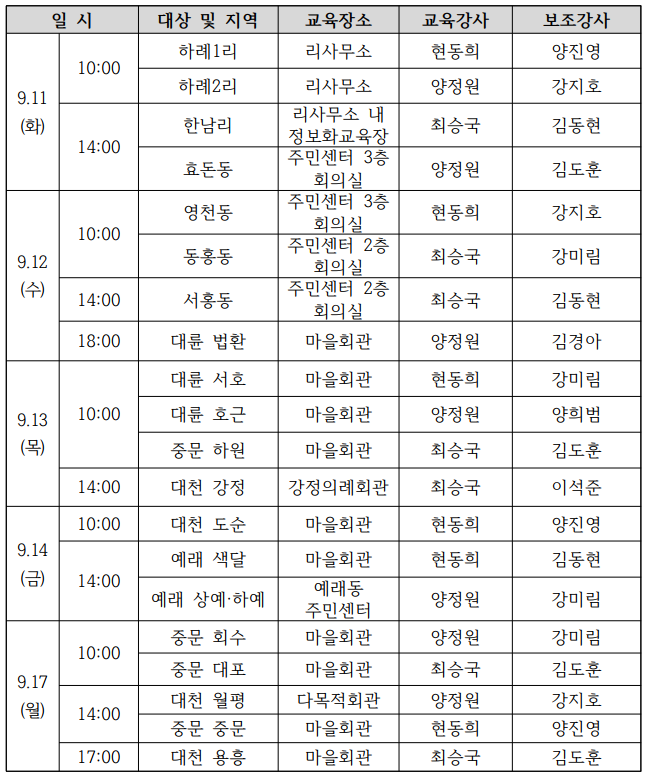 교육운영방법 : 매일 오전·오후 팀으로 운영(1시간 내외 교육)
