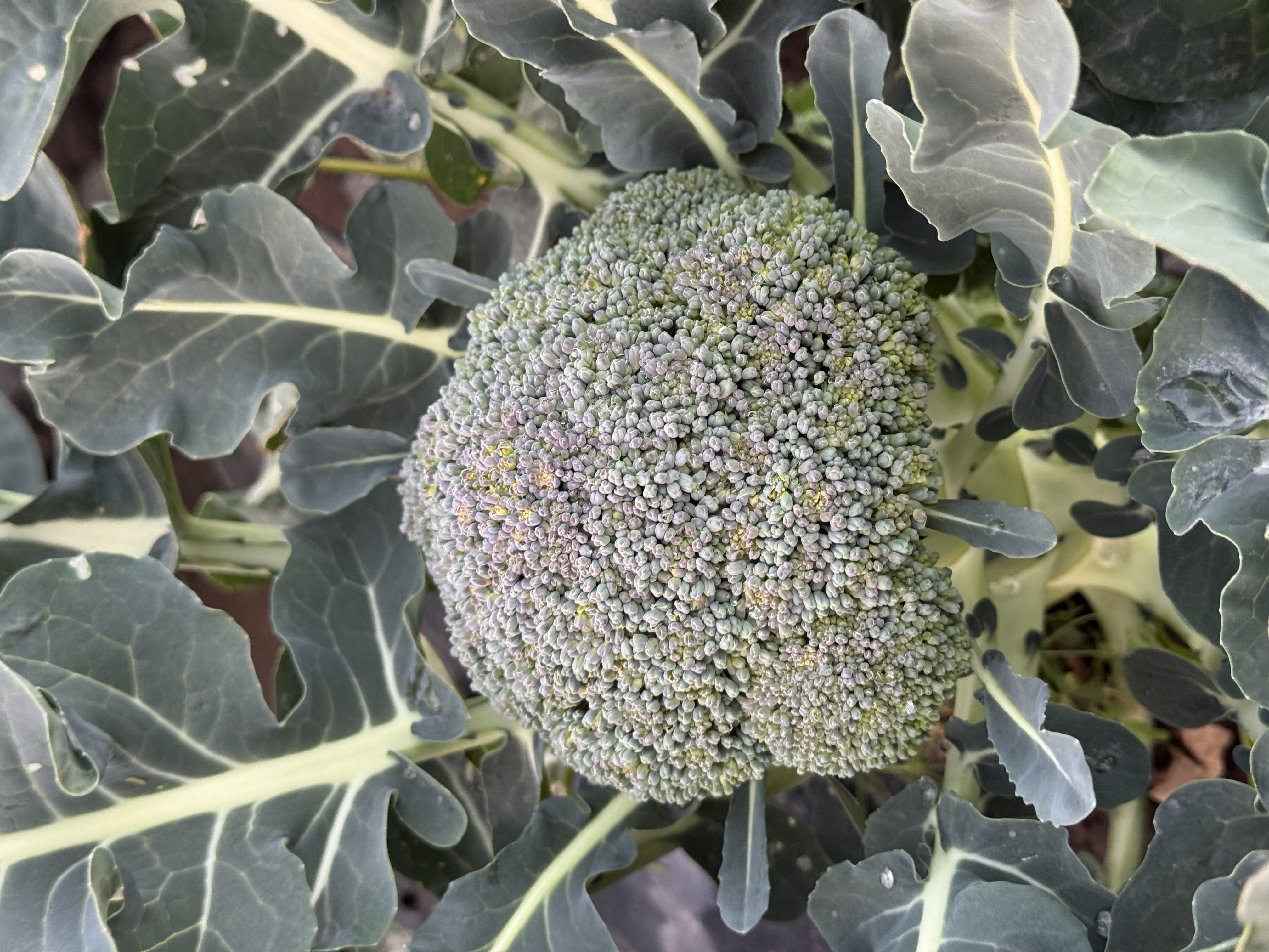 브로콜리 화뢰와 양배추 결구의 크기가 충분히 크지 않은 상태에서 변색이 함께 나타난 점을 고려했을 때, 정식 시기가 다소 늦었거나 귀하께서 말씀하신 것처럼 관수가 부족하여 양배추, 브로콜리 생육이 지연되었고 수분 부족으로 인한 안토시아닌 색소 발현이 함께 이루어진 것으로 생각됩니다.