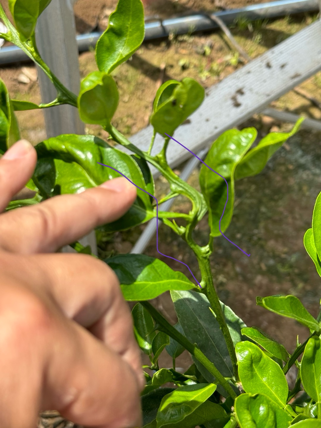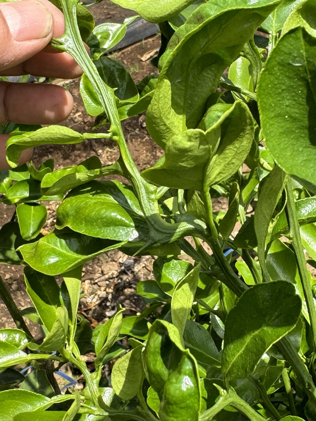 천혜향 묘목에서 ㄱ자로 구부러진 새순은 그 상태로 녹화됩니다. 사진상으로 보면 영양이나 수분부족에 의한 증상은 아닌 것으로 판단되며 가지가 구부러진 안쪽으로 노랗게 탈색된 흔적이 보이고, 새 잎 형태도 고르지 않은 것으로 보아 총채벌레 가해가 있었던 것으로 추정됩니다. 이런 가지는 구부러진 부위 아래에서 적심(절단)하여 녹화 시킨 후 새 가지가 발생 될 수 있도록 관리하시기 바랍니다.