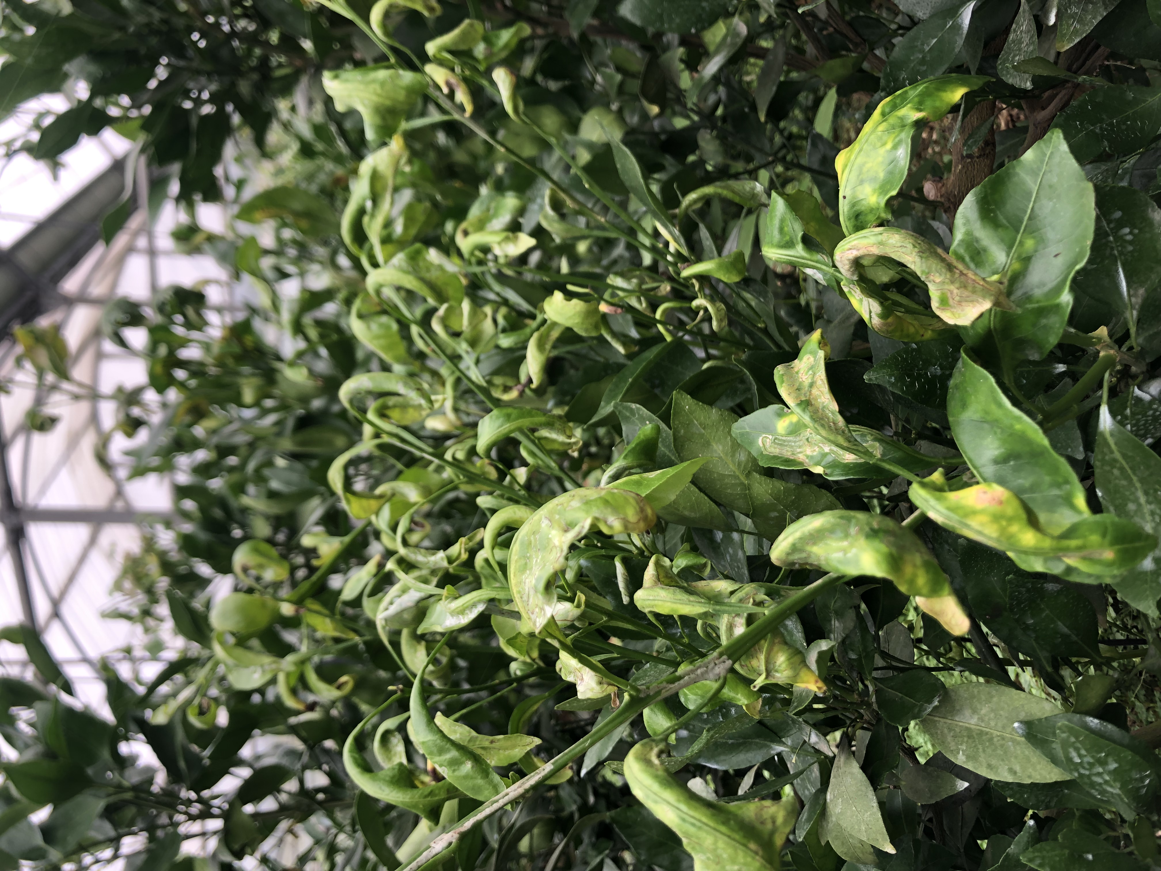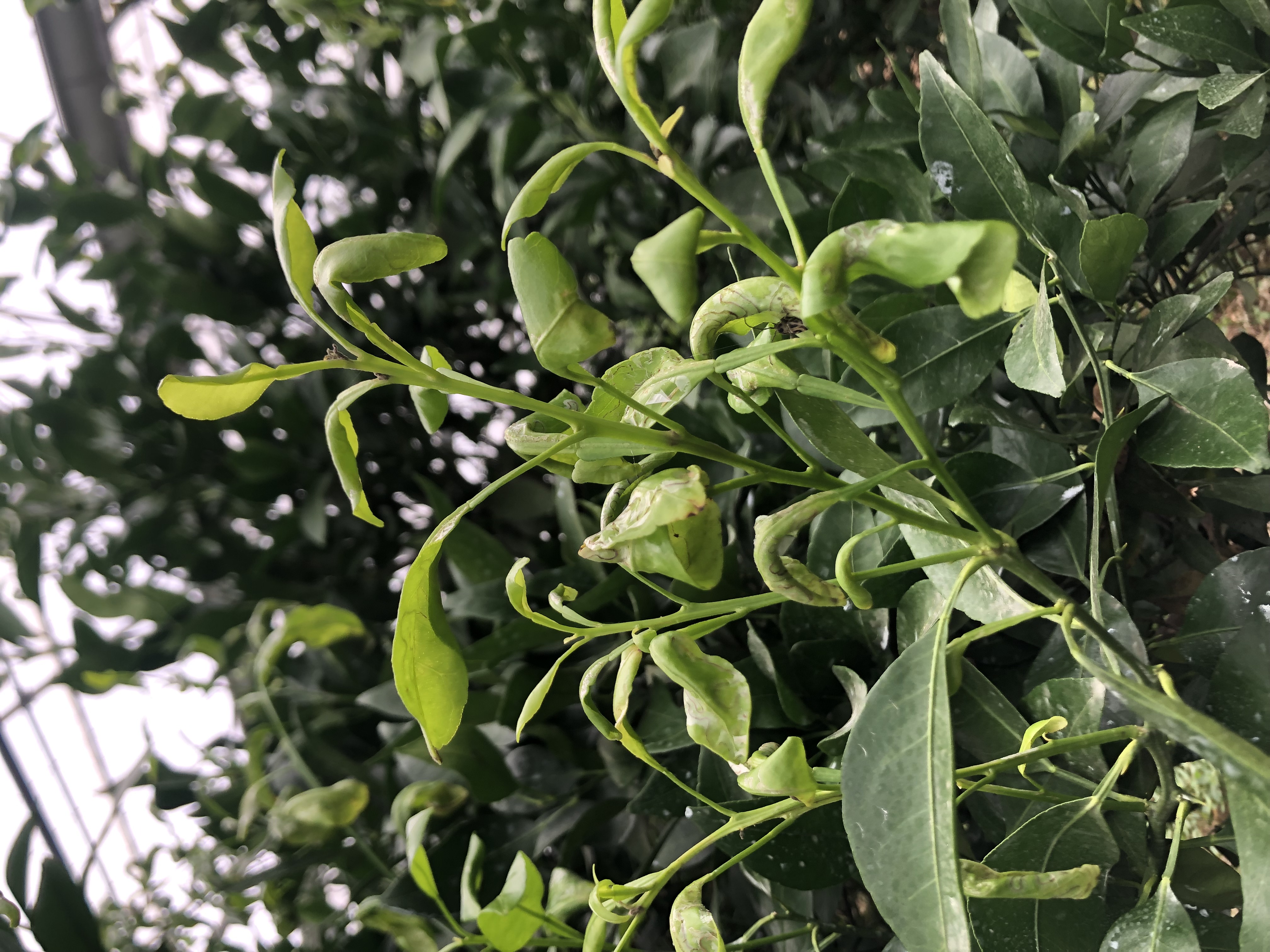 ○ 사진으로 볼 때 레드향 새순이 귤굴나방 피해를 받아서 나타난 증상입니다.